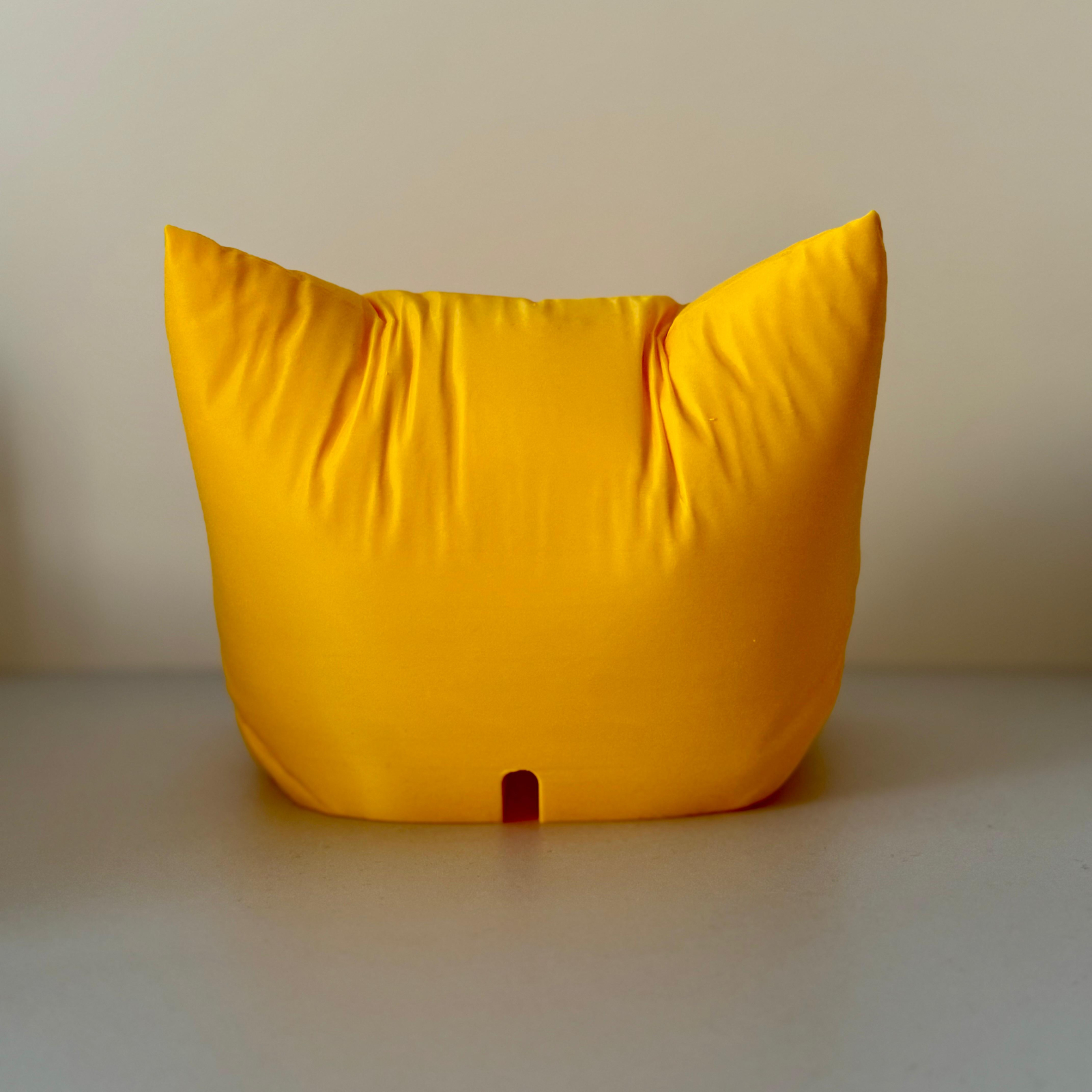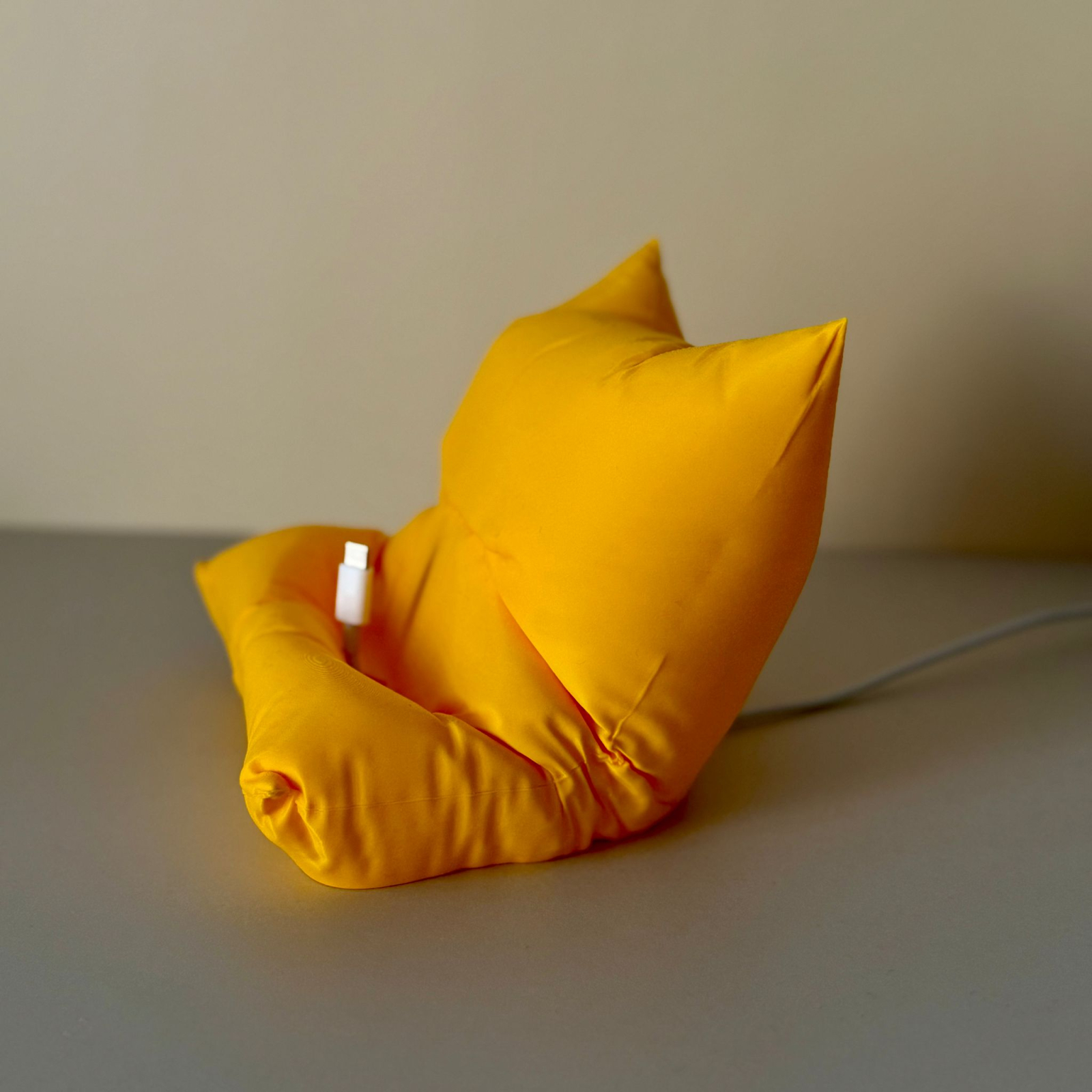 Deși are aspectul unei perne, suportul este realizat din material PLA, prin printare 3D, oferind stabilitate și rezistență în timp. Este gândit astfel încât să mențină telefonul într-un unghi confortabil pentru vizionare, apeluri video sau scroll, iar pe dedesubt are un spațiu special pentru cablul de încărcare — ca să poți folosi telefonul chiar și atunci când se încarcă.